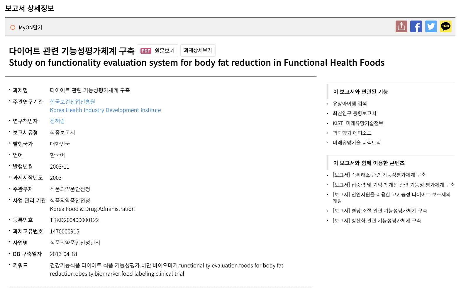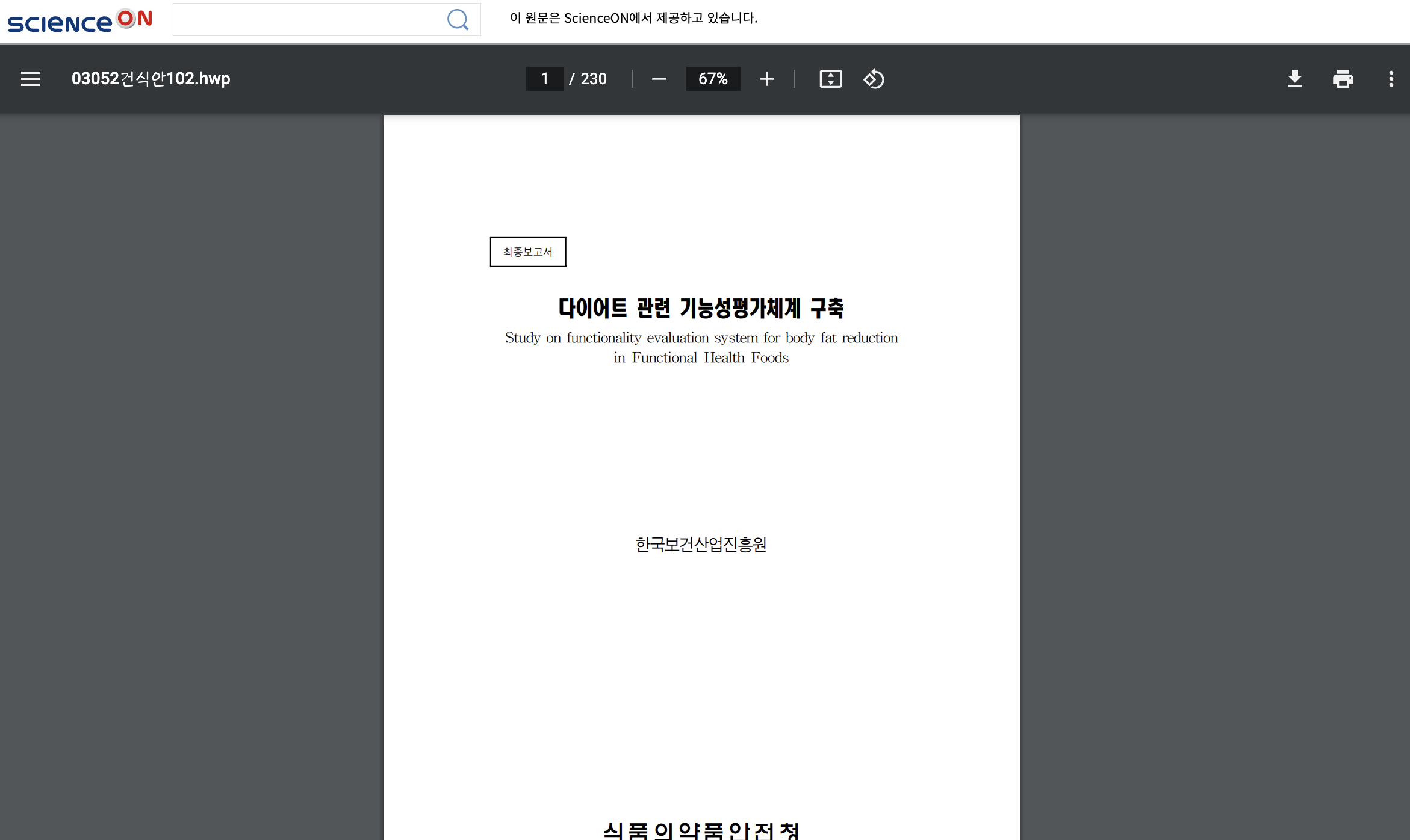 그 중 맨 위에 있는 R&D보고서 '다이어트 관련 기능성평가체계 구축'에 관하여 관심이 가서 클릭해보겠습니다.
