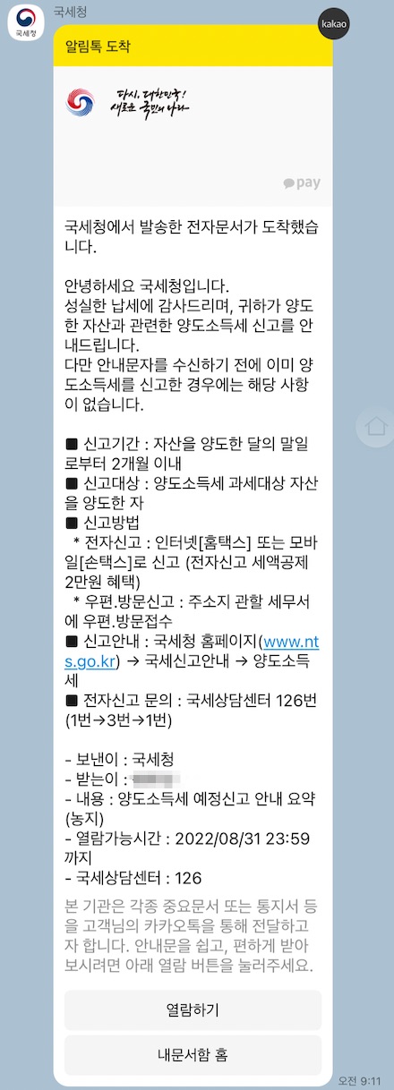 얼마 전 카톡으로 6월에 경매로 취득한 물건에 대한 양도소득세 세금 신고 안내문이 도착했습니다.