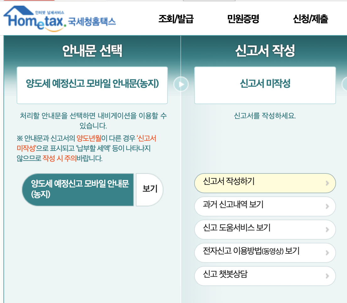 홈택스(www.hometax.go.kr)에 로그인하면 양도세 예정신고 관련 안내 팝업이 나옵니다. 신고서 작성하기를 눌러야겠습니다.