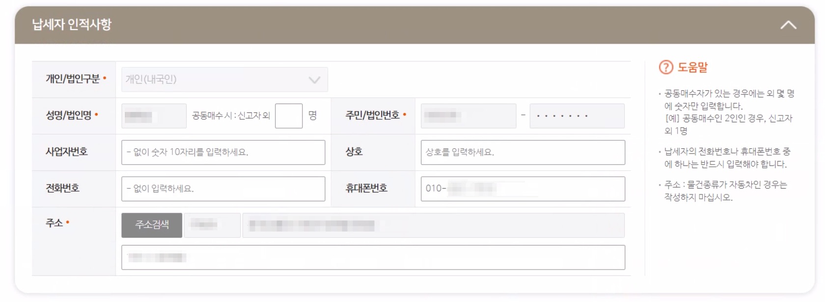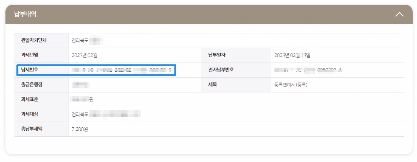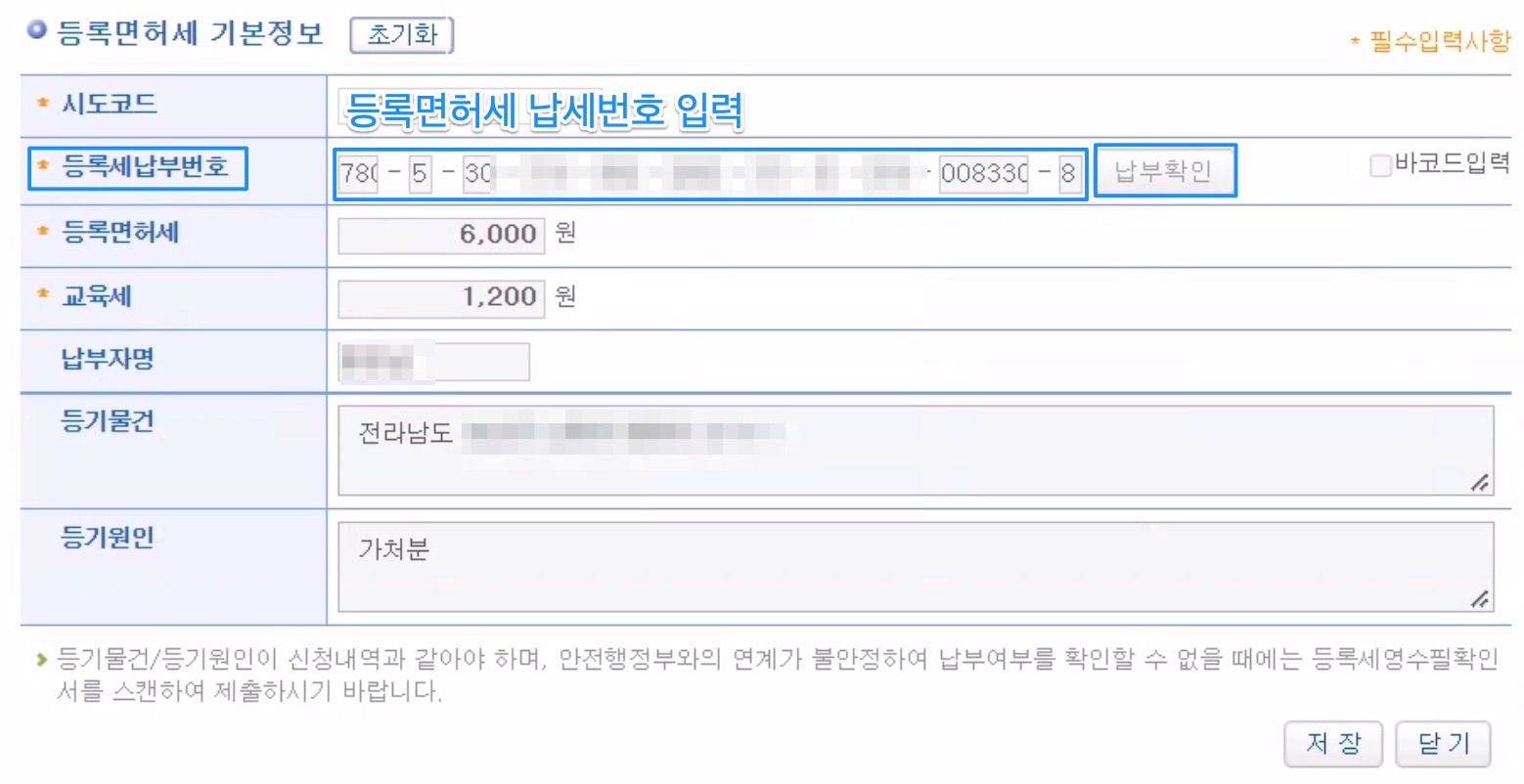 여기에서 등록세납부번호란에 등록면허세 납부내역 중 납세번호를 입력하고 납부확인 버튼을 눌러주면 아래쪽 정보는 자동으로 입력됩니다.