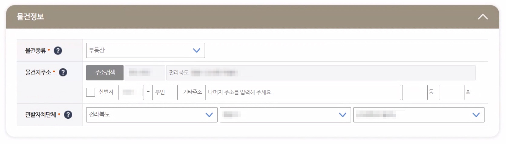 물건종류를 알맞게 입력해주시고, 물건지주소는 주소검색 버튼을 눌러 해당 부동산 주소를 입력해주세요.