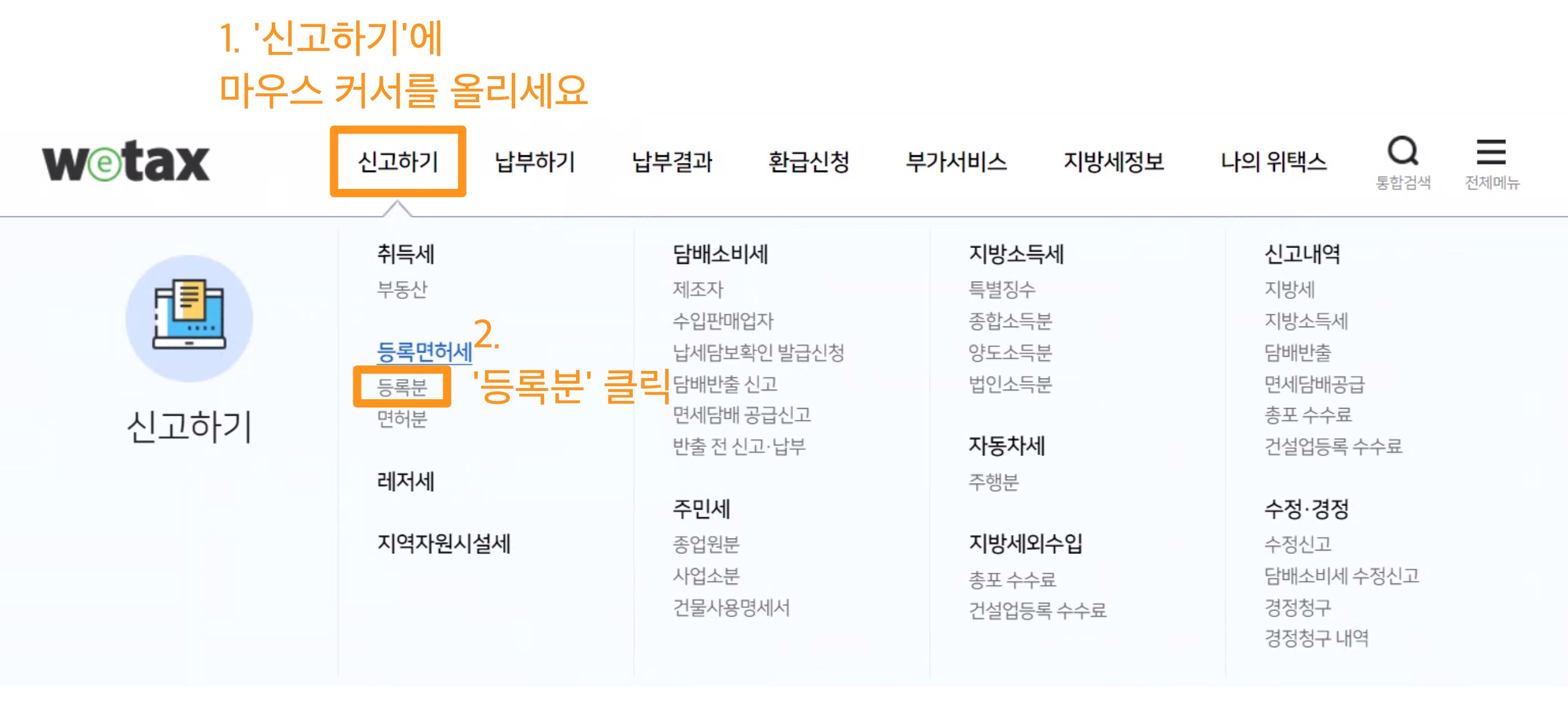 위택스에 접속하여 로그인하세요. 상단 메뉴의 ‘신고하기’에 마우스 커서를 올린 뒤 아래에 펼쳐지는 메뉴 중에서 ‘등록면허세’ 중 ‘등록분’을 클릭하세요.