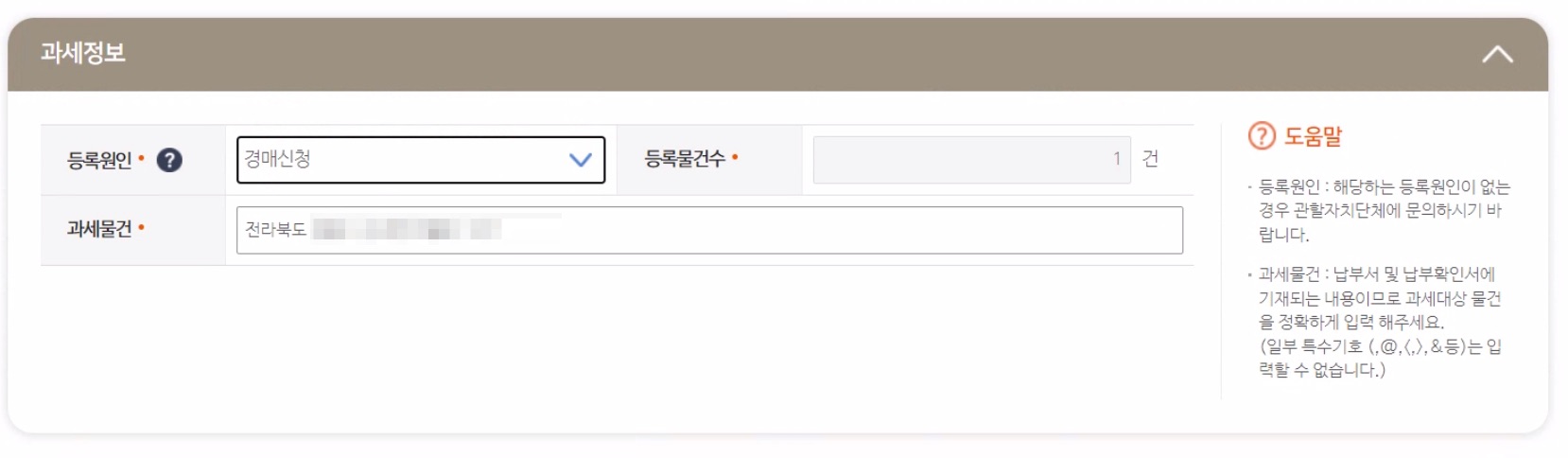 등록원인을 알맞게 선택하세요. 과세물건에는 해당 부동산 주소를 입력하면 됩니다.