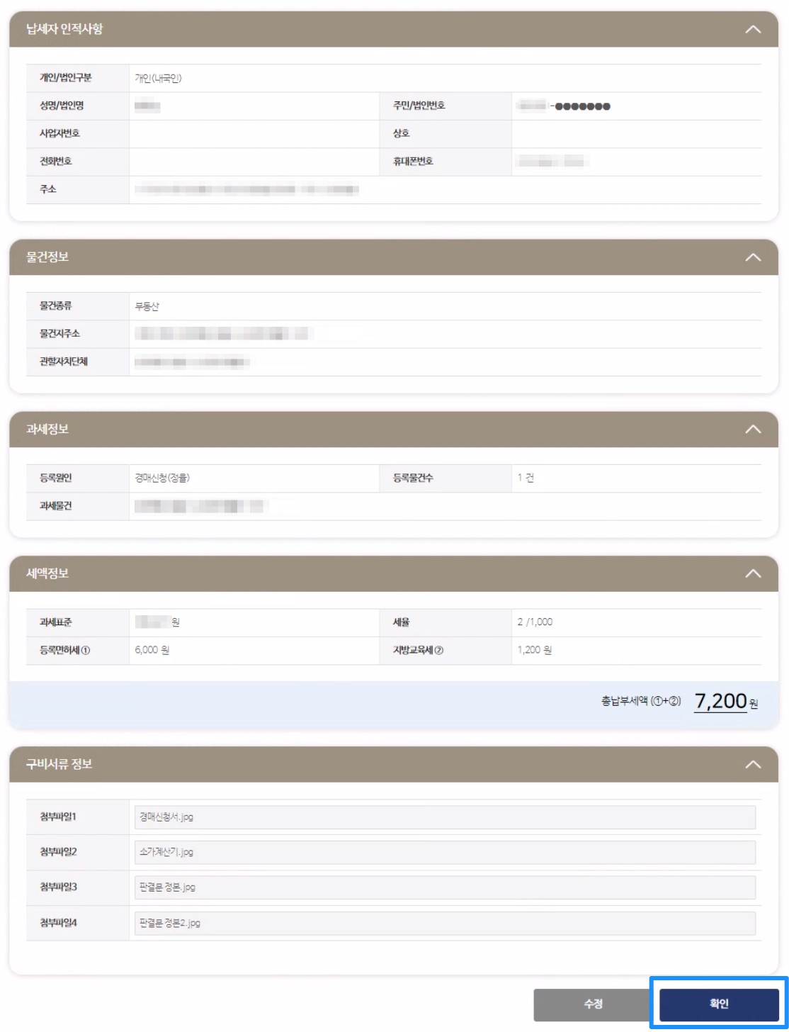 자신이 입력한 사항이 맞는지 확인합니다. 잘못 기재한 것이 있다면 수정 버튼을 눌러서 수정해주시고, 모두 잘 기재가 되어 있다면 확인 버튼을 눌러 넘어가시면 됩니다.