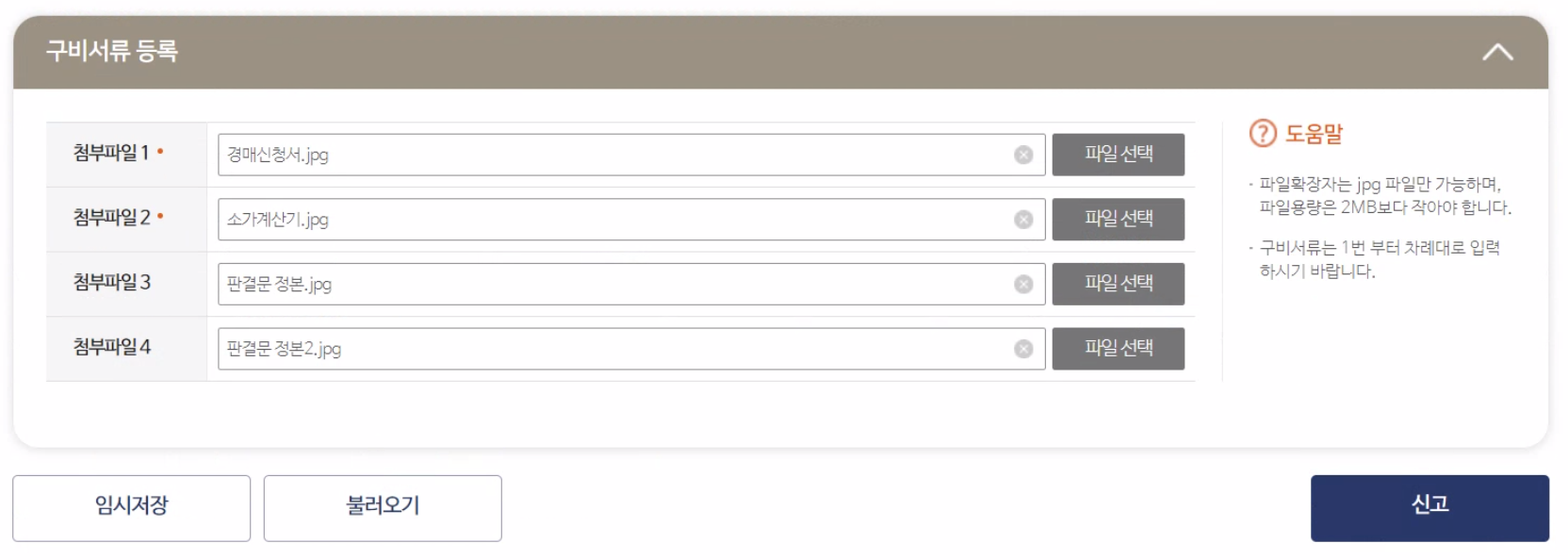 (구비서류 첨부 시 파일확장자는 jpg로만 가능하며 파일 용량은 2MB(메가바이트)보다 작아야 합니다.)
