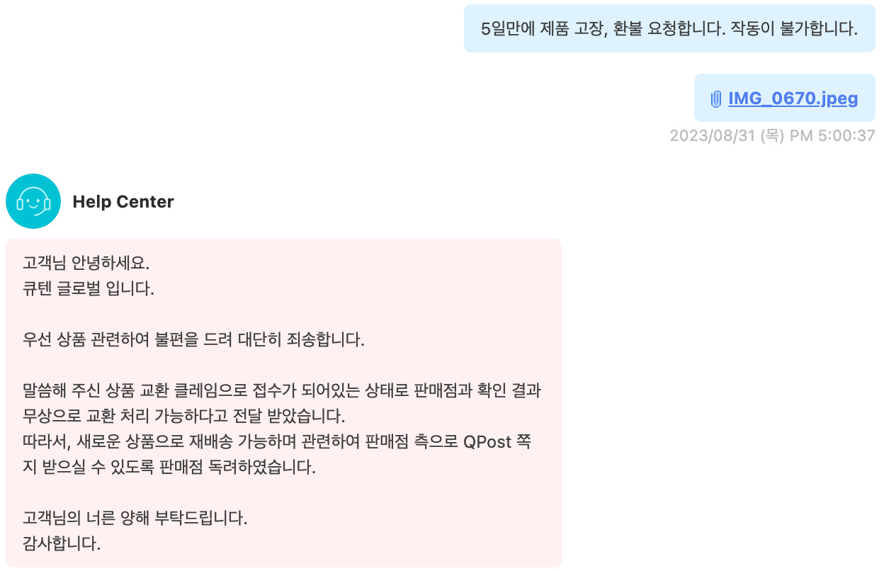 구매한 사이트인 Qoo10을 통해서 판매자와 큐텐 고객센터 측에 문의를 하였습니다.