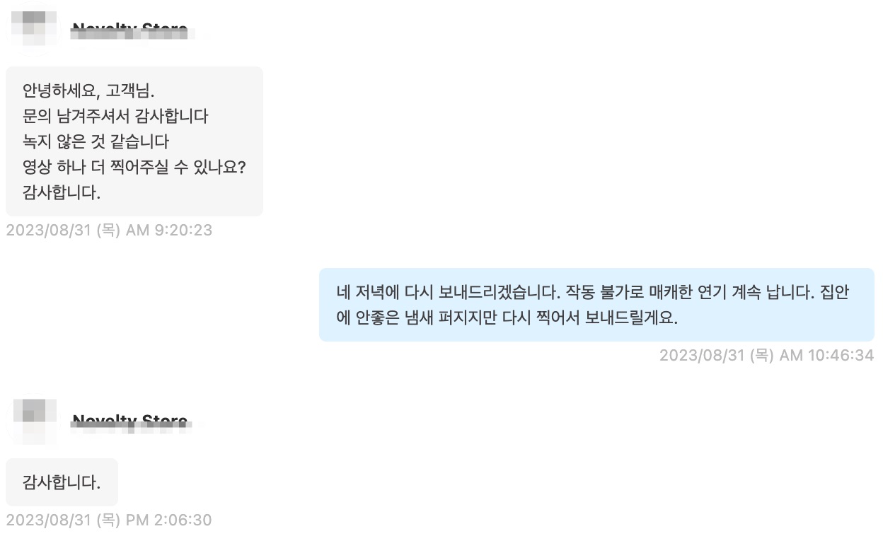 판매자는 고장이 난 것 같지 않다고 다시 영상을 보내달라고 하였습니다. 영상 첨부가 안돼서 판매자 이메일로 다시 보냈습니다. 그렇게 15일이 지났는데 아직 교환 상품은 오질 않았습니다. 처음부터 환불을 해달라고 했는데 환불을 안해주고 교환 처리를 해주더라고요.