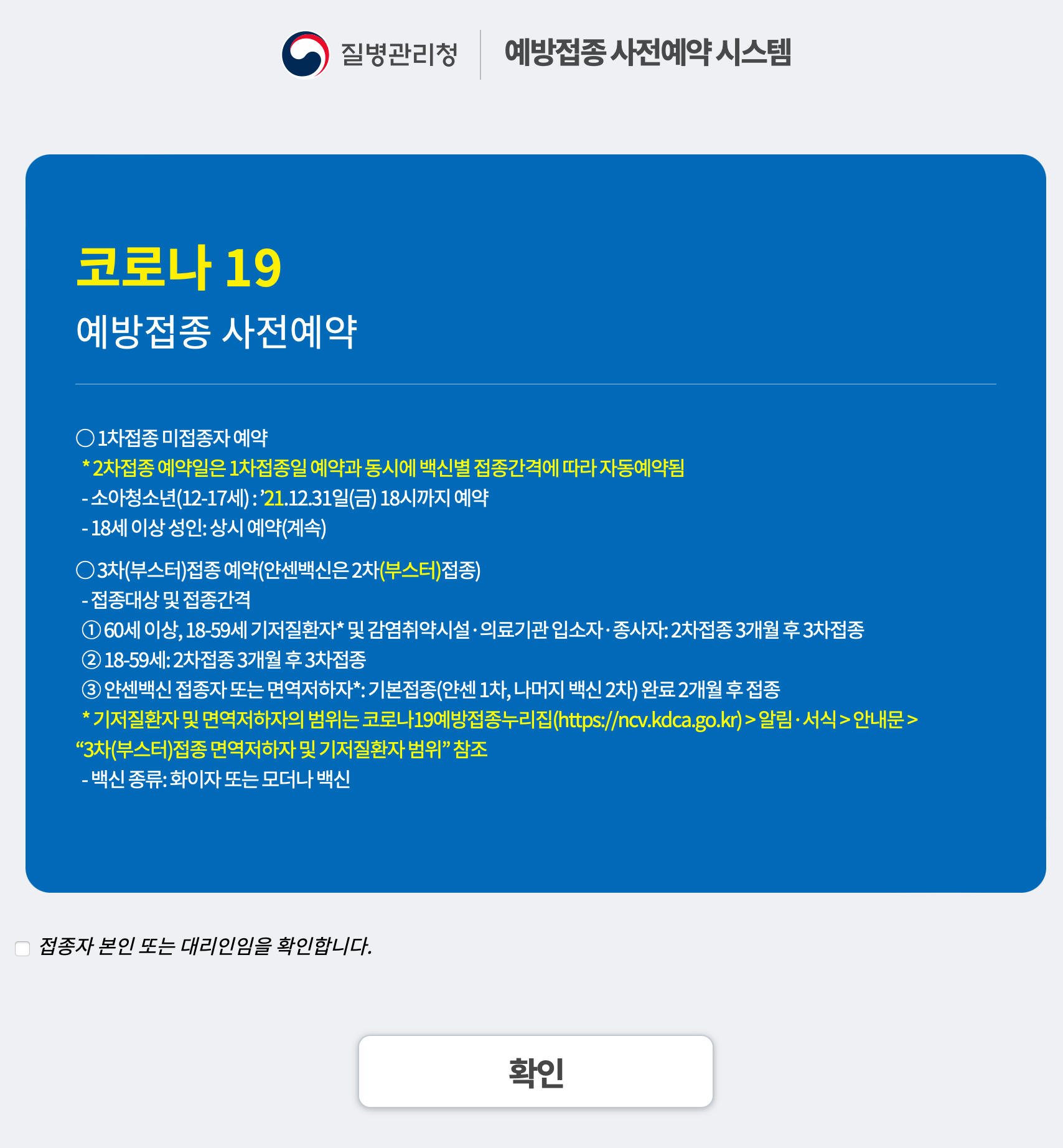 - 소아청소년(12-17세) : ’21.12.31일(금) 18시까지 예약