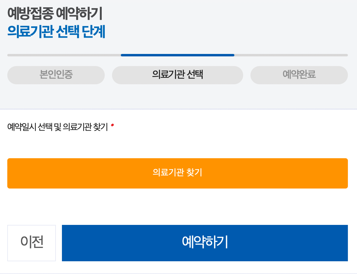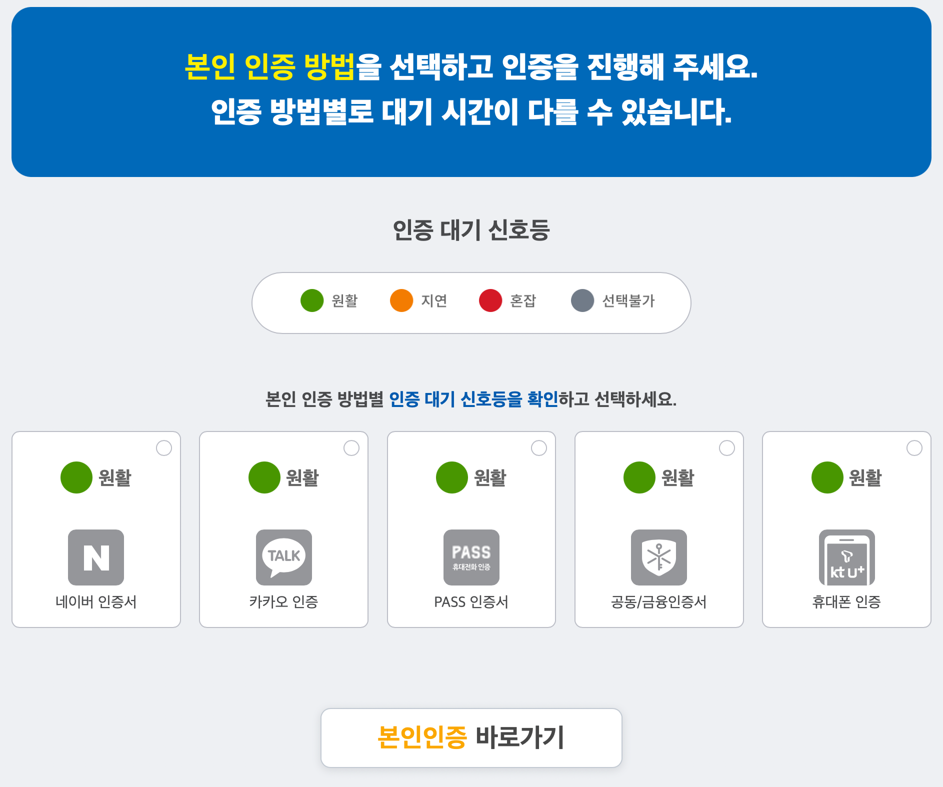 네이버 인증서, 카카오, PASS, 공동/금융인증서, 휴대폰 인증 중 하나로 인증을 완료하시면 예약 페이지로 이동합니다.