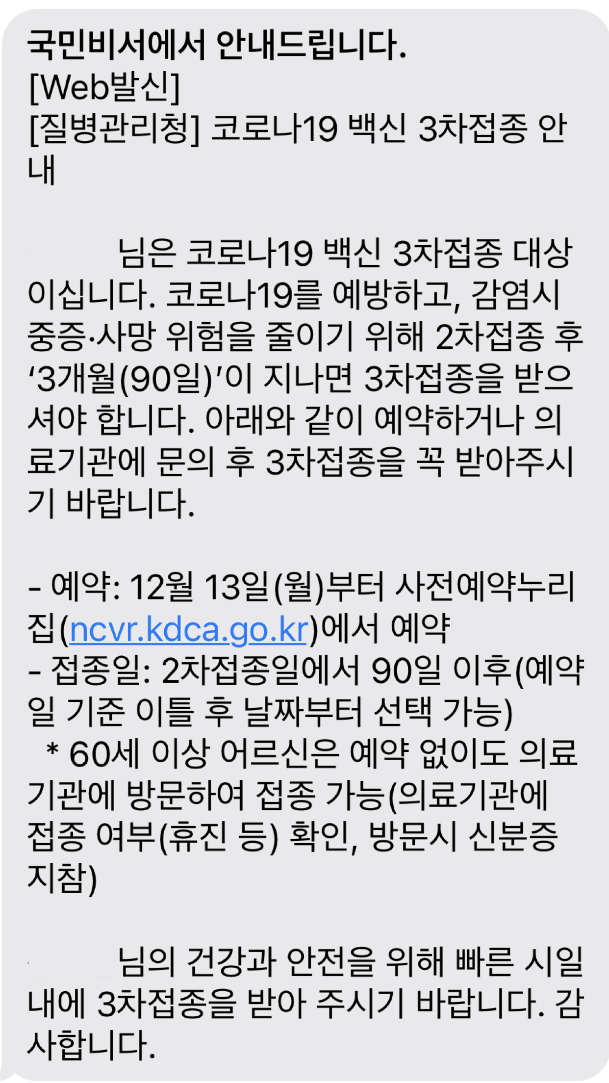 코로나19 백신 3차접종 안내 문자메시지를 받았습니다.