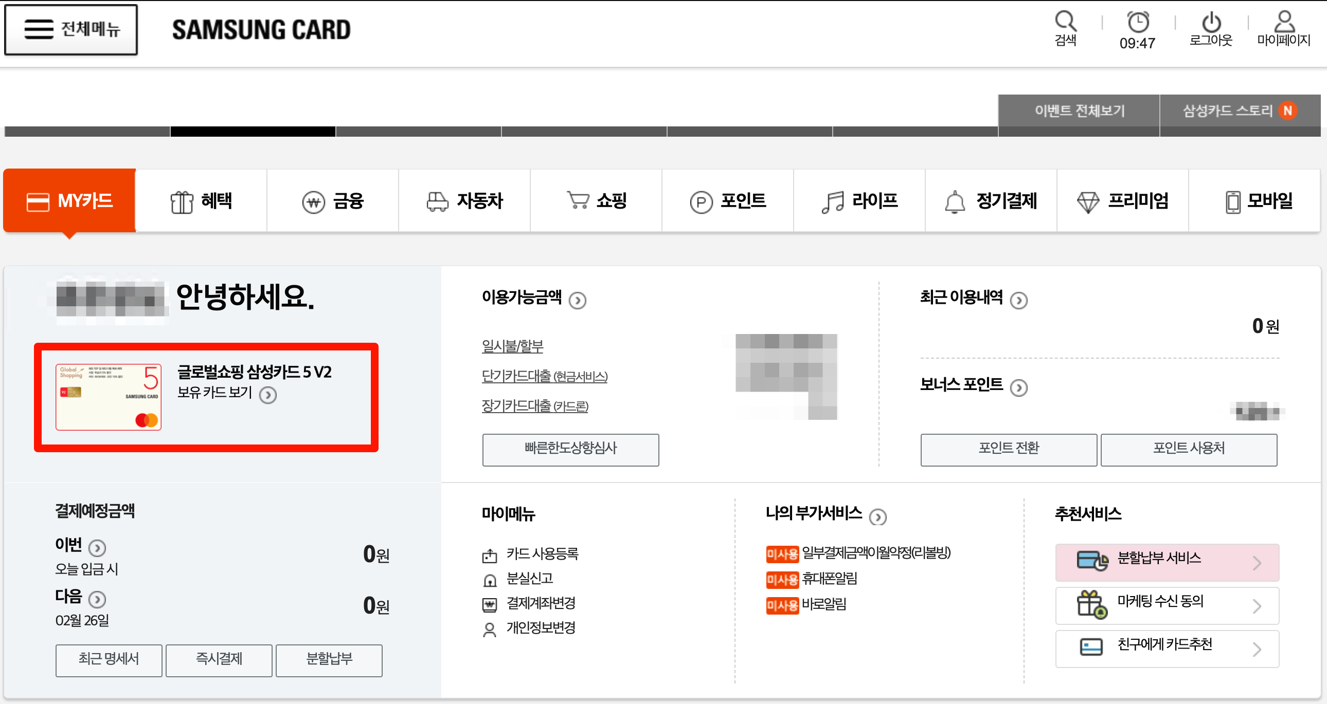 삼성카드에 로그인하여서 메인 페이지에서 보유 카드 보기로 들어갑니다.