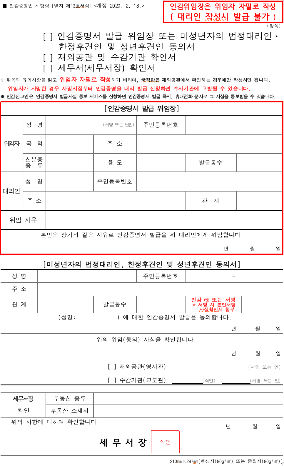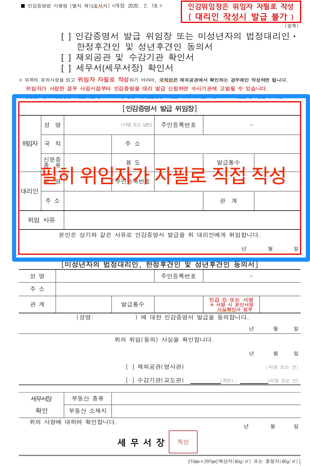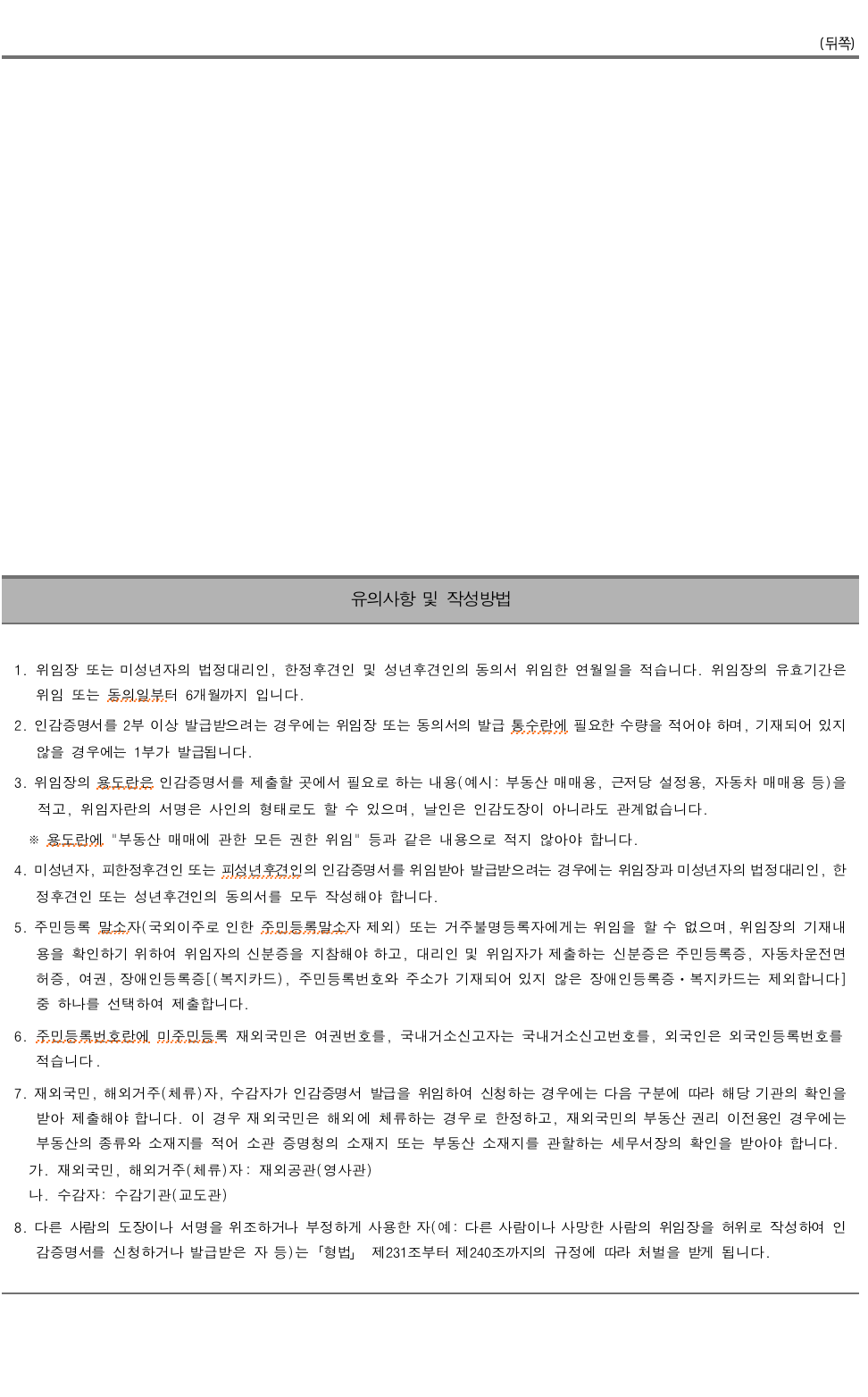 표시된 공간을 위임자가 직접 작성한 위임장을 들고 주민센터에 방문한다.